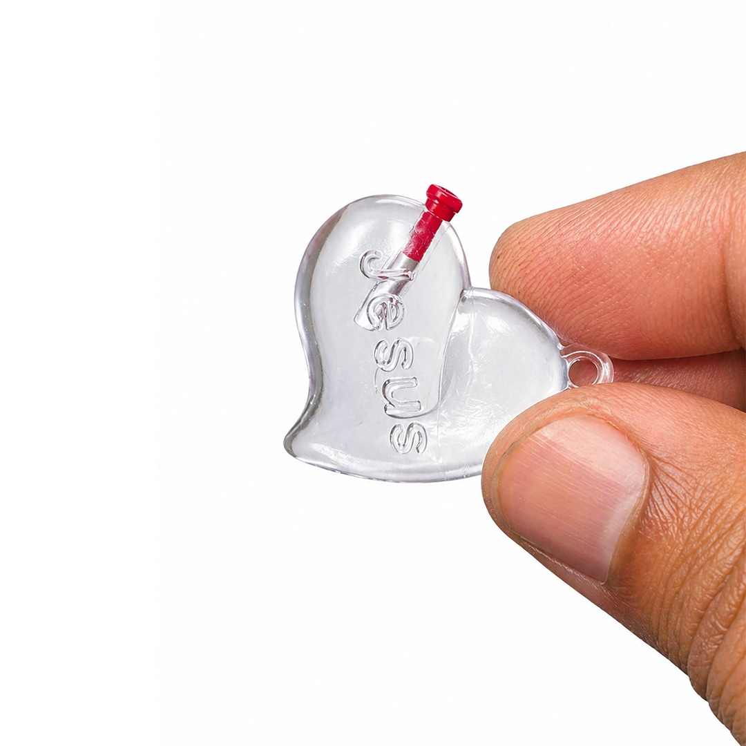 Pingente em formato de coração ideal para campanhas evangélicas, lembrancinhas de igreja e ações de fé. Produzido em acrílico transparente, possui acabamento delicado e tampa em silicone, permitindo o uso para óleo ungido, água consagrada ou pequenos itens simbólicos.